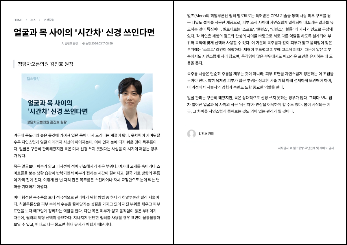 건강칼럼 「얼굴과 목 사이의 '시간차' 신경 쓰인다면」 페이지 정보 목록 게시판 리스트 옵션 검색 본문 헬스중앙 2026.03.17 다음글김진호 원장 칼럼 「목주름 치료, 개인별 맞춤 진단이 핵심」 25.11.17
