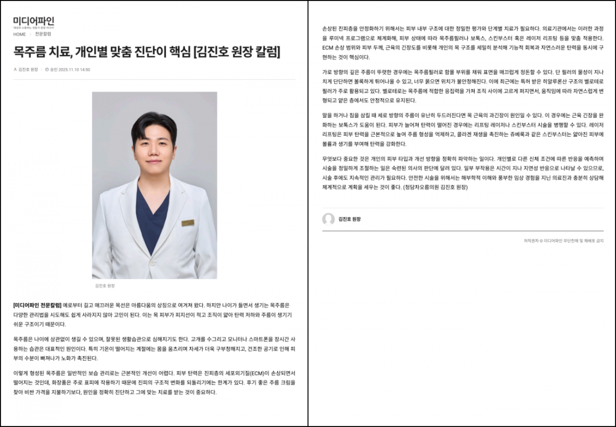 김진호 원장 칼럼 「목주름 치료, 개인별 맞춤 진단이 핵심」 페이지 정보 목록 본문 미디어파인 2025.11.10 이전글BELOTERO® (목주름 필러) 키닥터 웹 심포지움 강연「가로목주름 케이스별 최적의 접근법」 26.03 26.03.12 다음글건강칼럼 「스킨부스터 시술, 엘라비에 리투오 통한 피부회복 접근법」 25.11.17